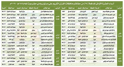 وبلغ عدد الأوائل الذين حققوا المراكز العشرة الأولى في هذه الدفعة (35) حافظاً وحافظة، حيث تصدرت منطقة بور المشهد بحصول (12) حافظة على المراكز الأولى، تلتها مدينة سيئون بـ (9)، ثم منطقة حورة بـ (8)، وتأتي في المرتبة الرابعة مدينة تريم التي حصل منها (4) حفاظ على المراتب الأولى، فيما سجلت منطقتا الغرف ومسيلة آل شيخ اسم كل منهما بحافظ واحد.