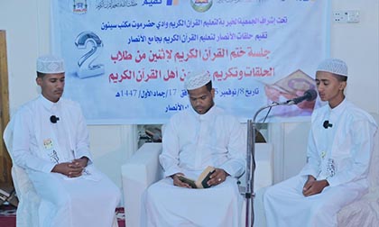 تحت إشراف الجمعية الخيرية لتعليم القرآن الكريم - وادي حضرموت (مكتب سيئون)، أقامت حلقات مسجد الأنصار مساء السبت 8 نوفمبر 2025 الموافق 17 جمادى الأولى 1447هـ جلسة ختم القرآن الكريم