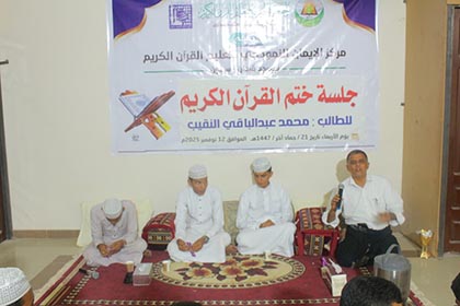 في أجواء إيمانية أقام مركز الإيمان النموذجي بمسجد قيدان التابع للجمعية الخيرية لتعليم القرآن الكريم - وادي حضرموت (مكتب سيئون) مساء الأربعاء 12 نوفمبر 2025م جلسة الختم الرابعة لهذا العام