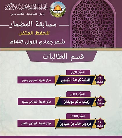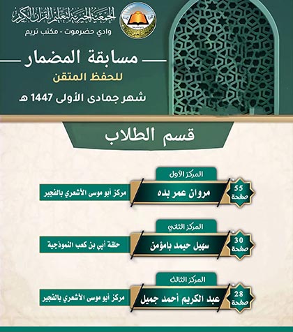 شهد مكتب الجمعية الخيرية لتعليم القرآن الكريم - وادي حضرموت (تريم) تألقًا قرآنيًا مميزًا ضمن مسابقة (المضمار) للحفظ المتقن لشهر جمادى الأولى 1447هـ،